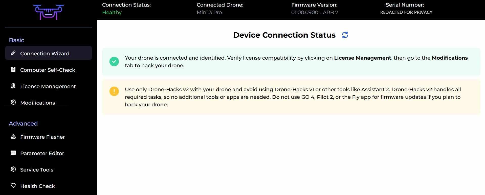 Drone-Hacks V2 supports the Mini 3 Pro, this page will detail the exact steps you need to perform to license and apply hacks to your drone.