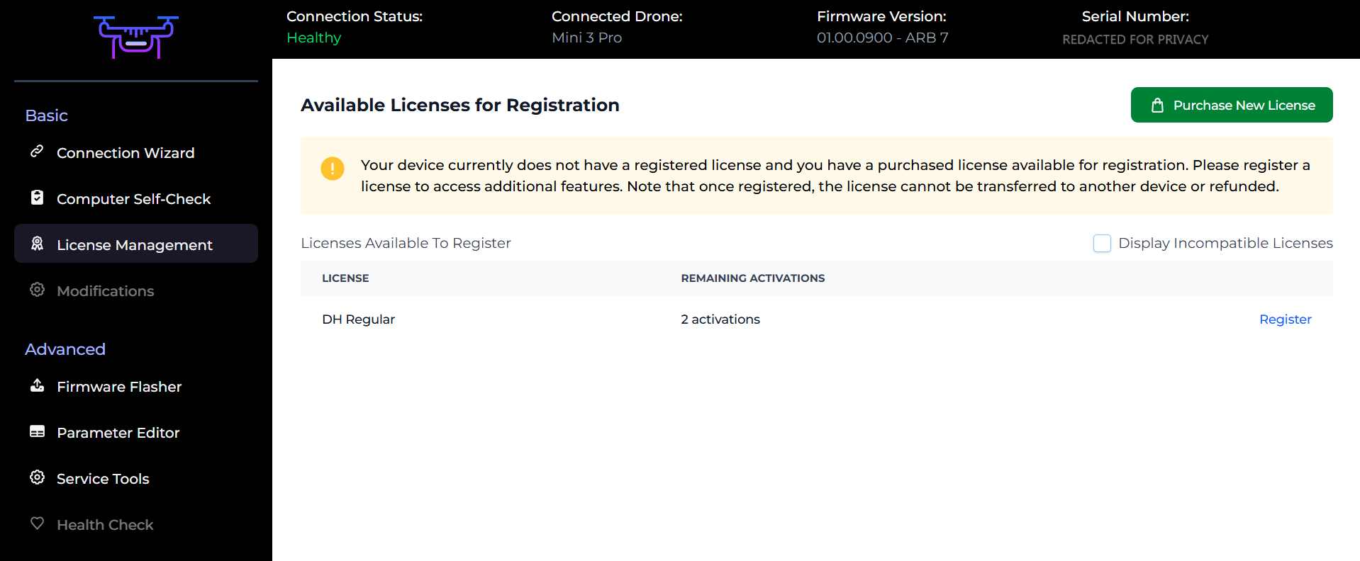 Simply select “License Management” and you should see the “DH Regular” license you purchased. Click the “Register” button to bind this license to your drone.