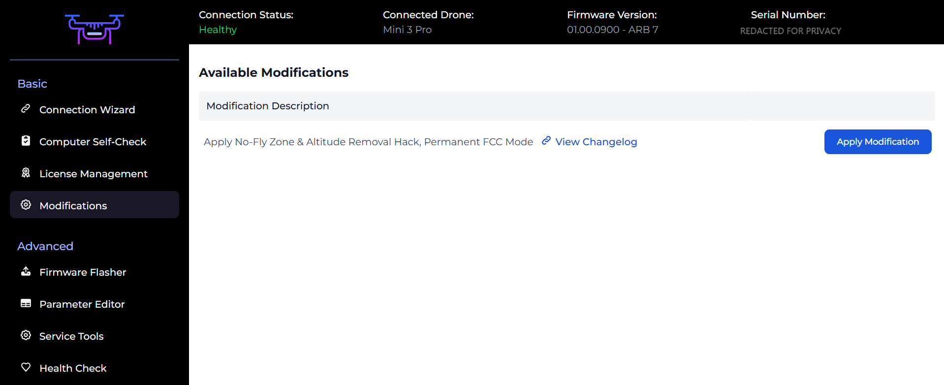 With the drone now licensed, you can apply any available hacks to your drone. To do this, select the Modifications button and then click “Apply Modification”