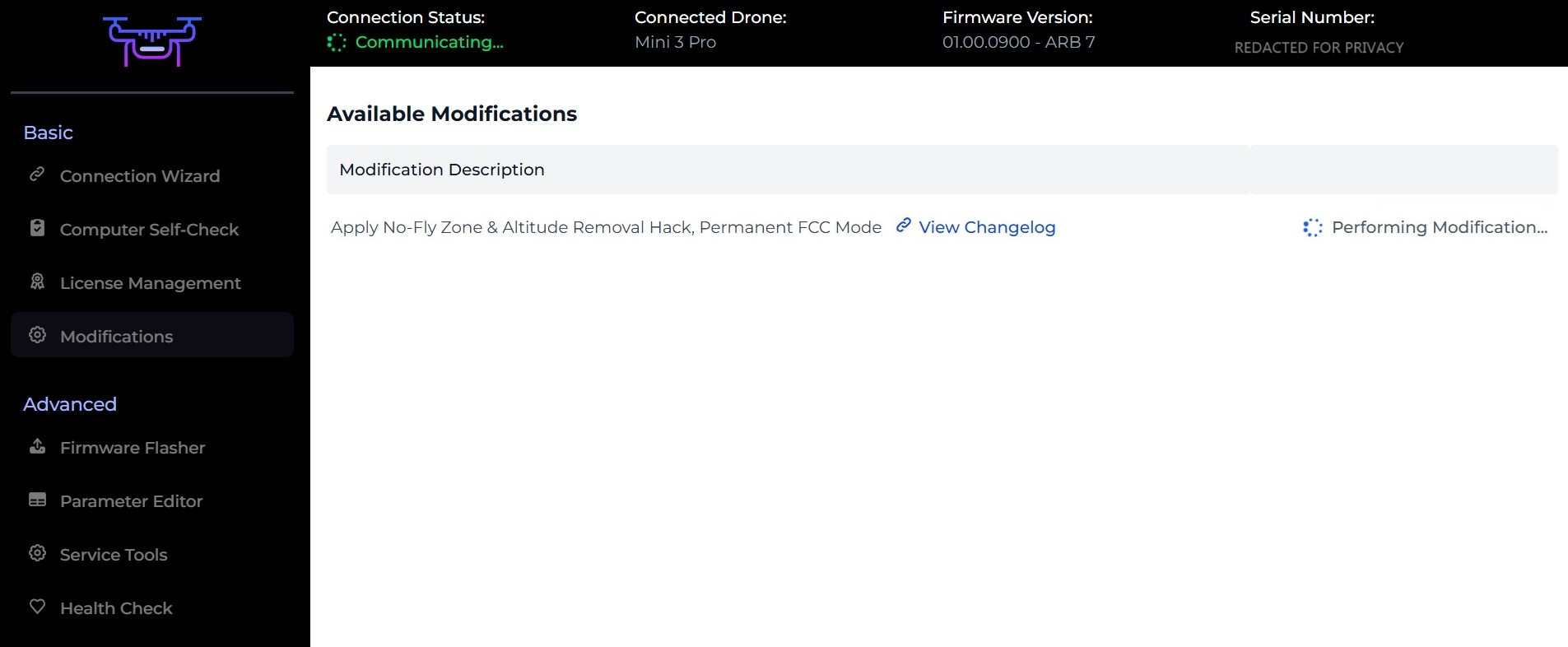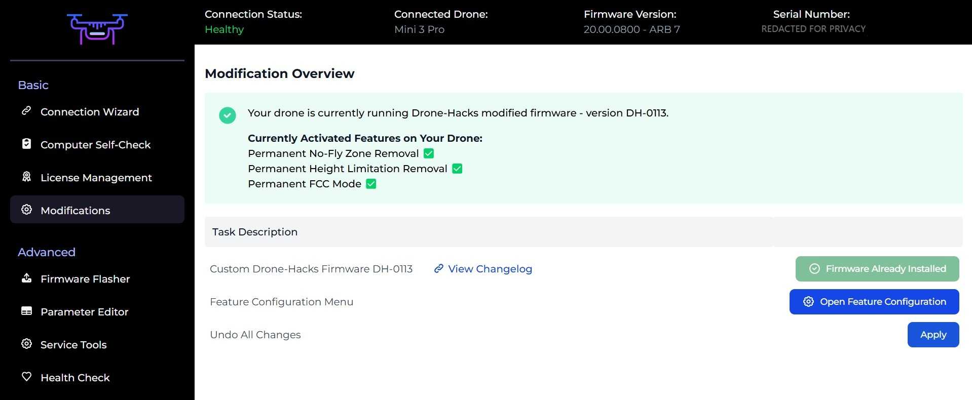 If for whatever reason you wish to remove all Drone-Hacks hacks and return your drone to stock configuration, this is also now super easy to do. Simply click the Modifications button and select “Apply” next to the ‘Undo All Changes’ option.