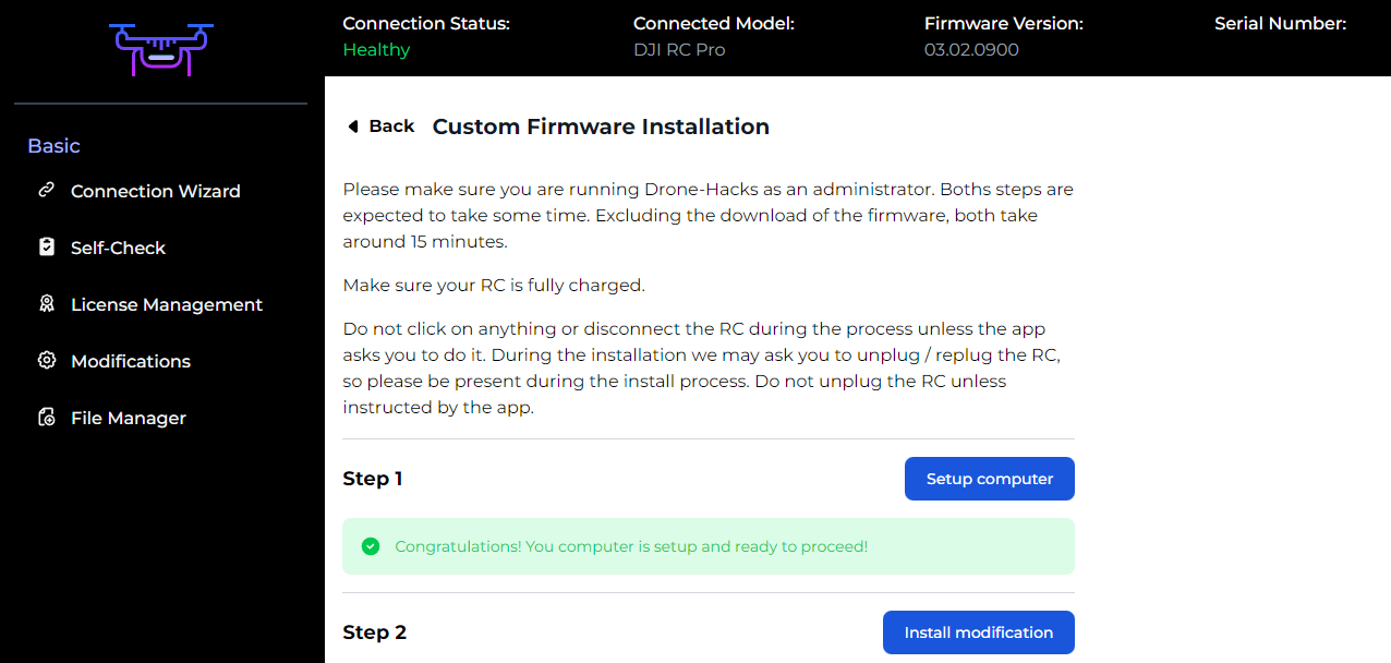 Connect your RC to your PC using the included USB cable. After a few moments the RC should be detected and you will see this message in the Drone-Hacks window.