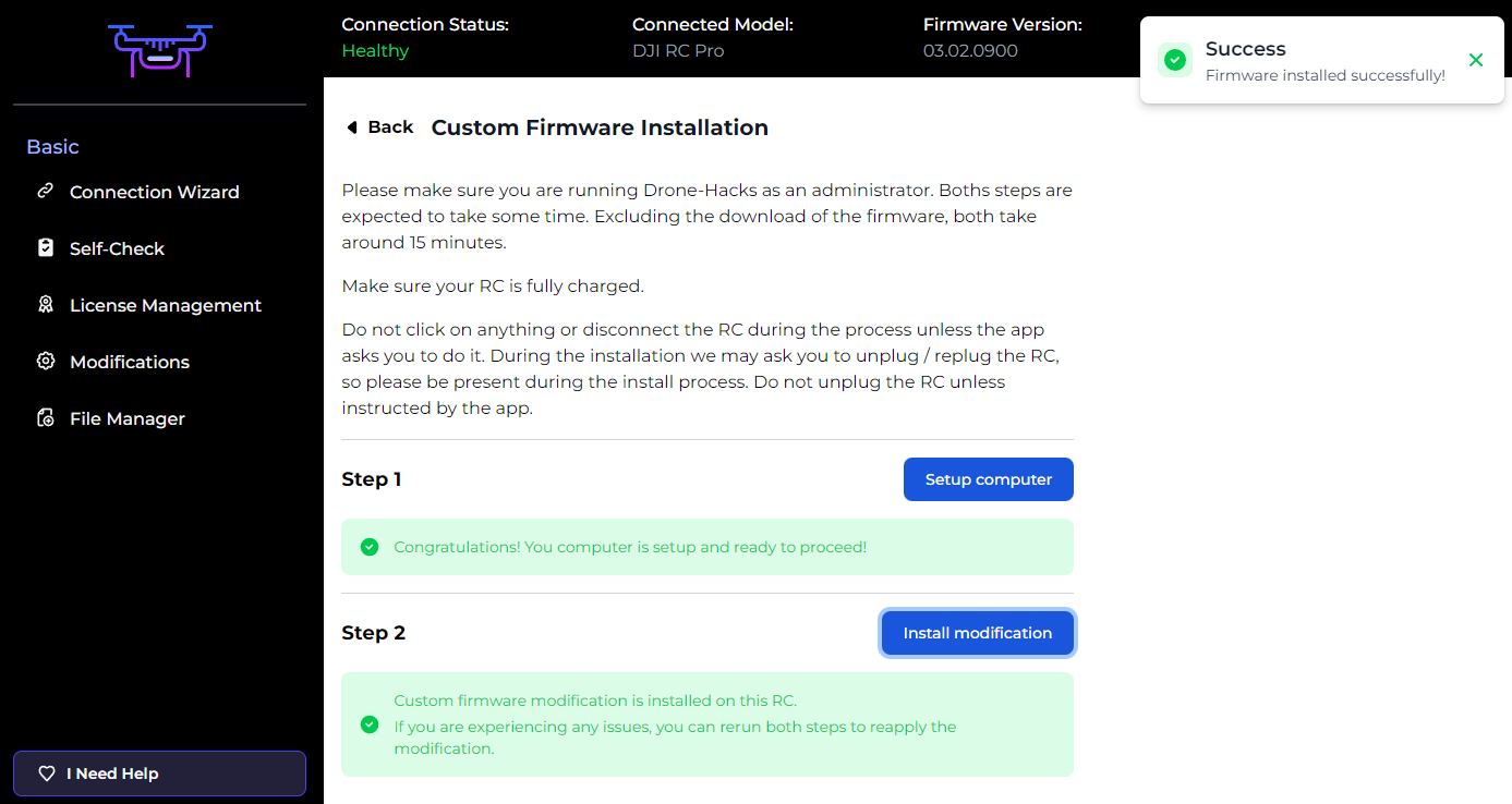 Finally, our last step in the Drone-Hacks app, you should see a confirmation message the the modifications have been installed.