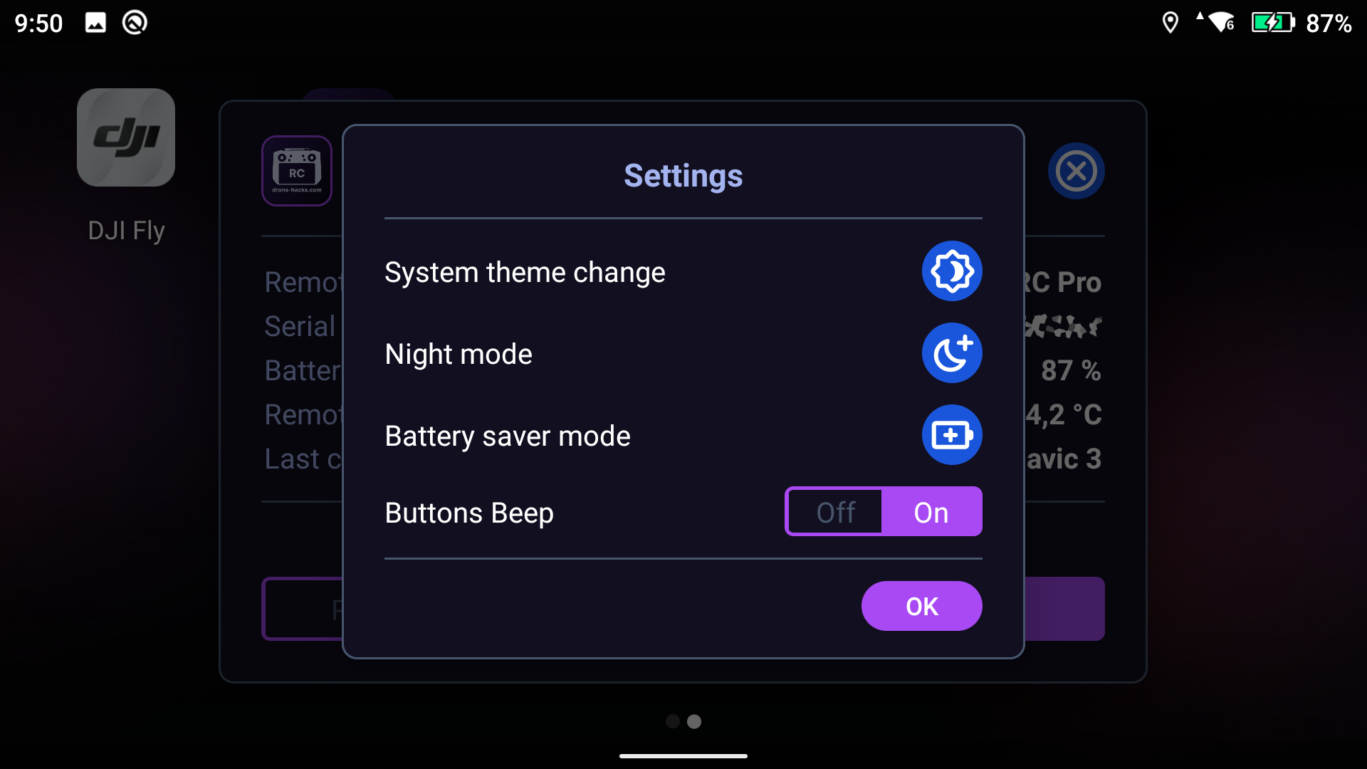 When inside the "Drone-Hacks RC" app, if you tap the wrench/spanner icon, you will have a few different options you can configure. Feel free to experiment with these, but you can finally turn off the extremely loud ‘beep’ when the RC buttons are pressed!