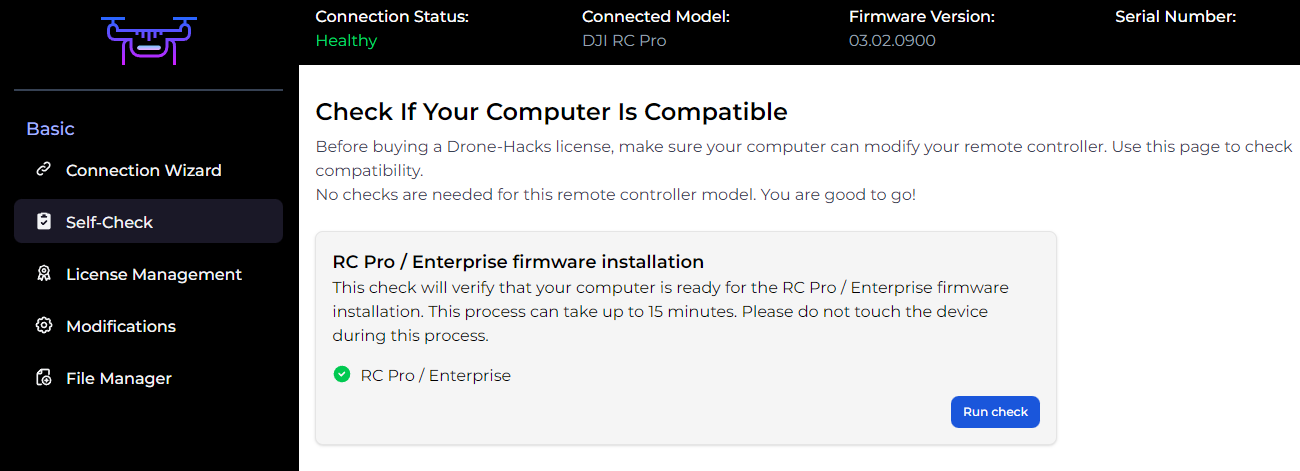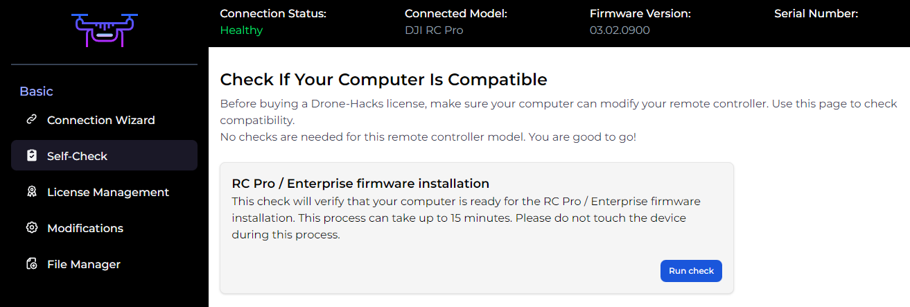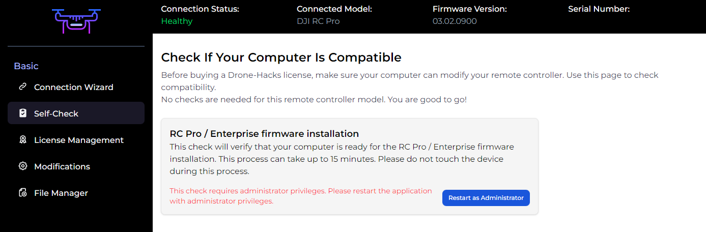 To do this, click the “Self Check” option. Drone-Hacks needs administrator permissions to do this, so if you see this button, simply click it to auto-restart the app as an administrator.