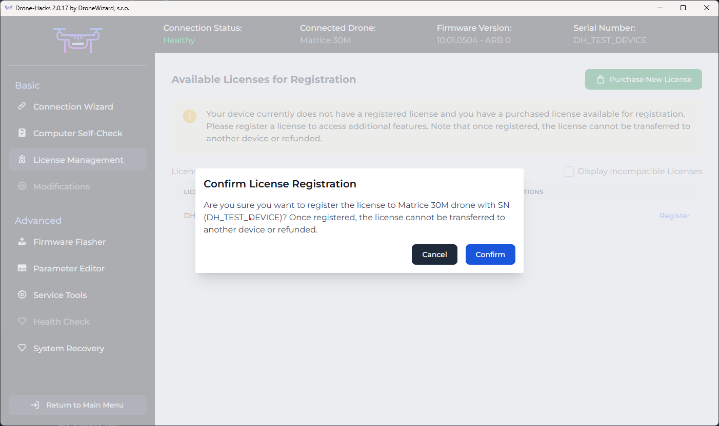 Simply select “License Management” and you should see the “DH Enterprise for Matrice 30 / 30 T'” license you purchased. Click the “Register” button to bind this license to your drone.