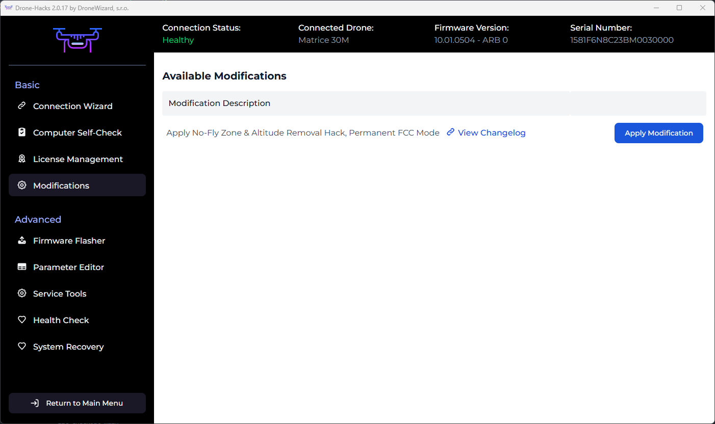 With the drone now licensed, you can apply any available hacks to your drone. To do this, select the Modifications button and then click “Apply Modification”